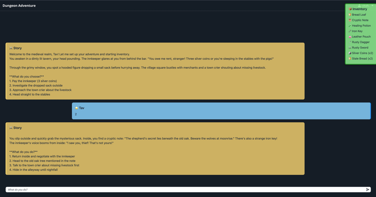 Imagine a dungeon master who never runs out of ideas. This text-based adventure uses AI to craft unique stories based on your choices and inventory. Every playthrough is different because the AI responds to what you actually do, not a pre-written script.
