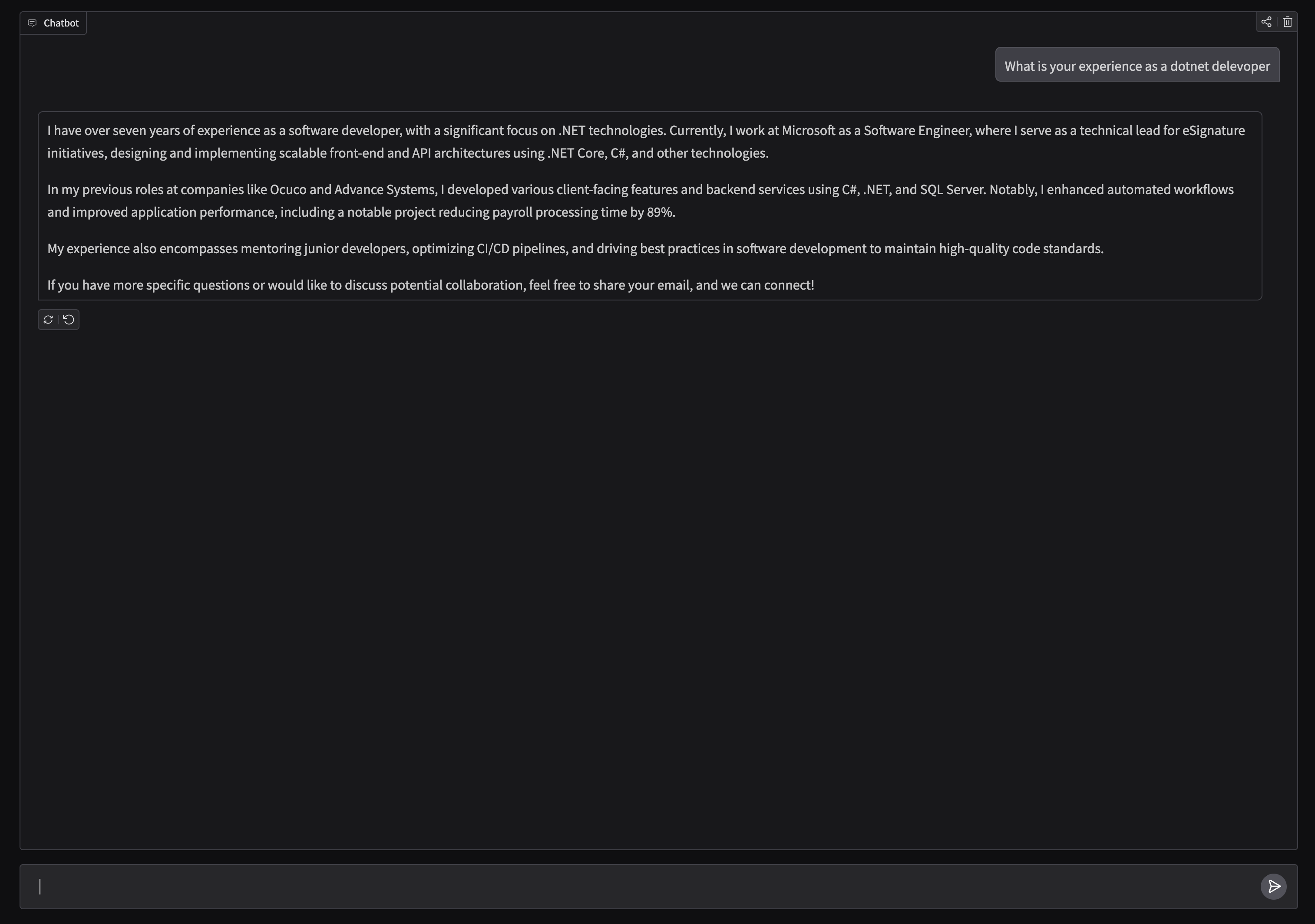 CVs are boring. So I made mine talk back. Ask my AI-powered CV anything about my experience, projects, or skills — it's like having a conversation instead of skimming bullet points. Available 24/7, unlike me.